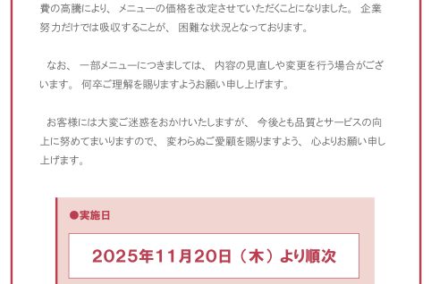 いつも焼肉食堂彩華をご利用いただき、誠にありがとうございます。 11月5日(水)...